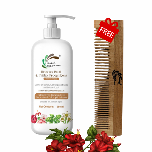 Vineroots Hibiscus, Basil & Tridax Shampoo | Sulfate & Paraben -Free | For Mild Dandruff Care, Stronger Roots & Healthy Scalp | 280ml | Get a Free Neem Comb