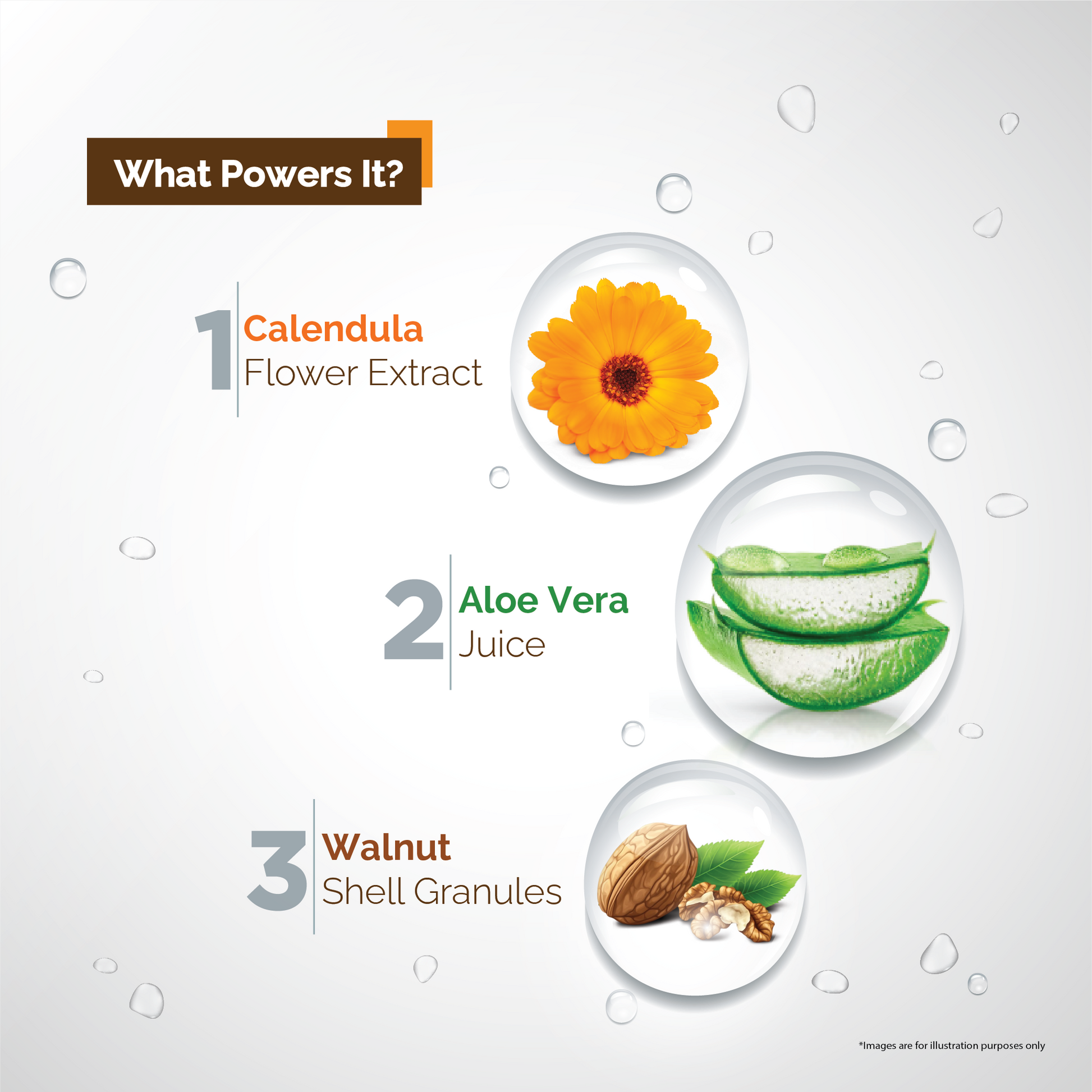 Walnut Shell Exfoliation – Contains finely ground Walnut Shell granules for mild exfoliation that removes dirt, and impurities leaving smoother and glowing skin.